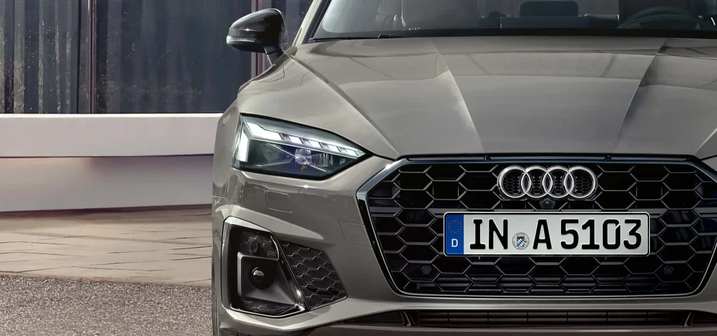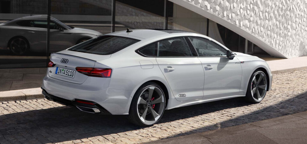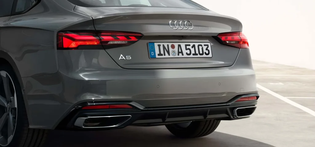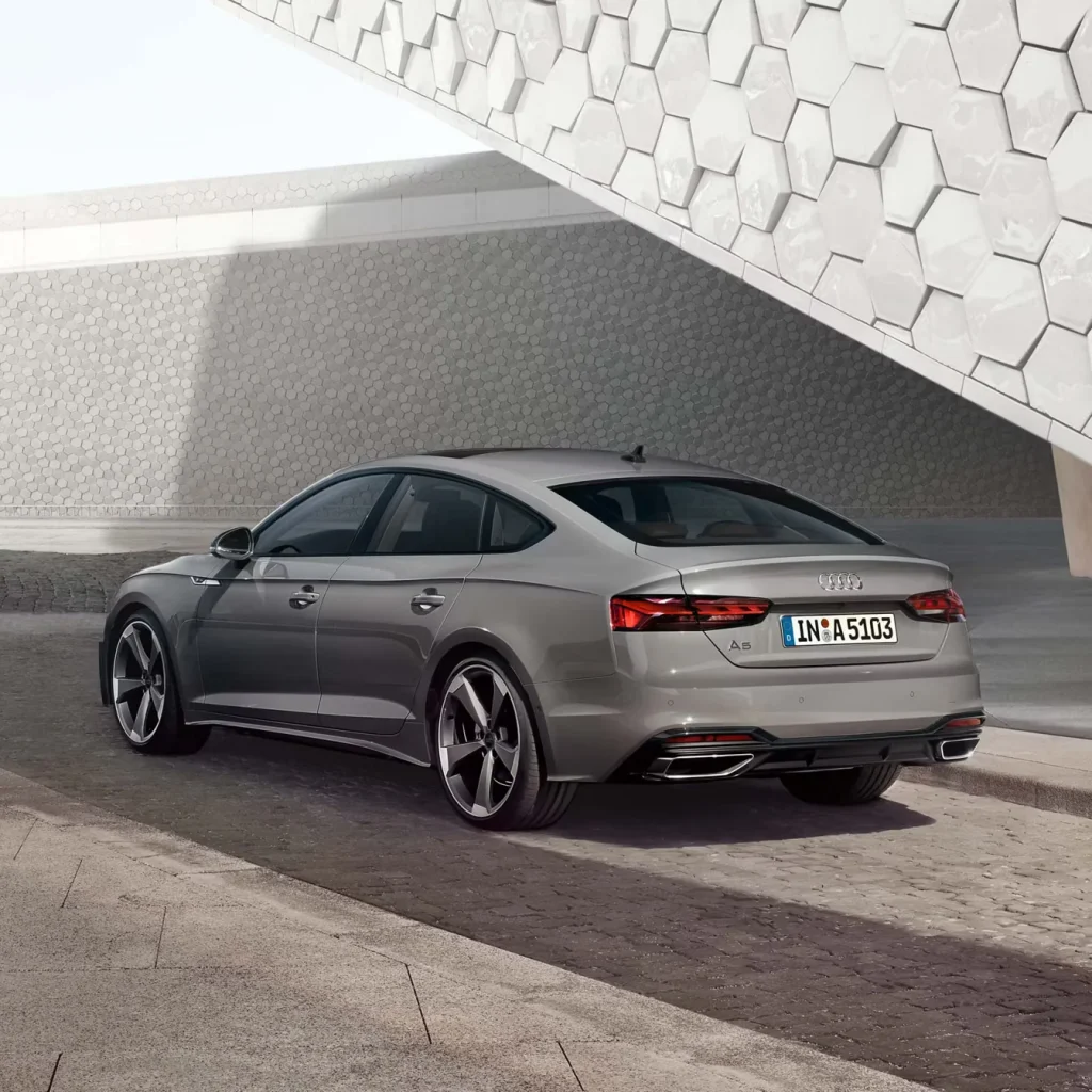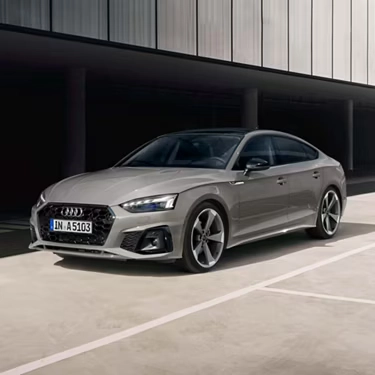 Wide air inlets and chrome trim give the front of this sporty five-door vehicle its edge. At the sides, mid-heavy sills underscore its sportiness and pronounced wheel arches emphasise the optional 20-inch alloy wheels. Horizontal trim in matt aluminium silver on the diffuser and trapezoid tailpipe trims reinforce the wideness of the rear. In addition, the Audi A5 Sportback can be customised with the optional advanced and S line equipment lines.