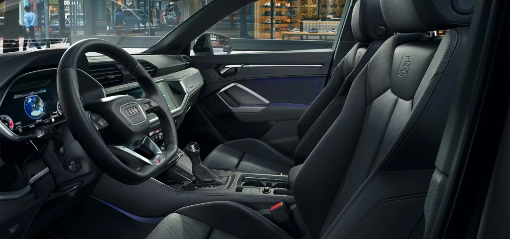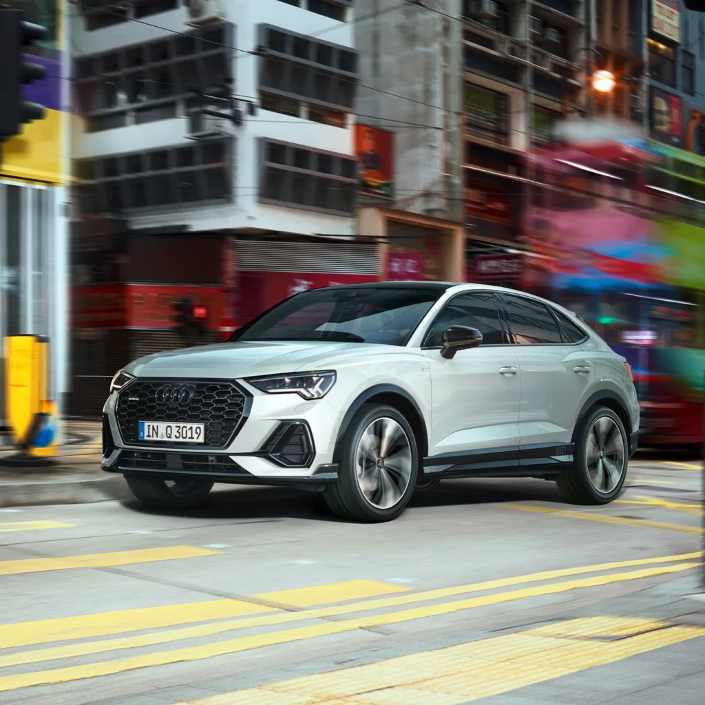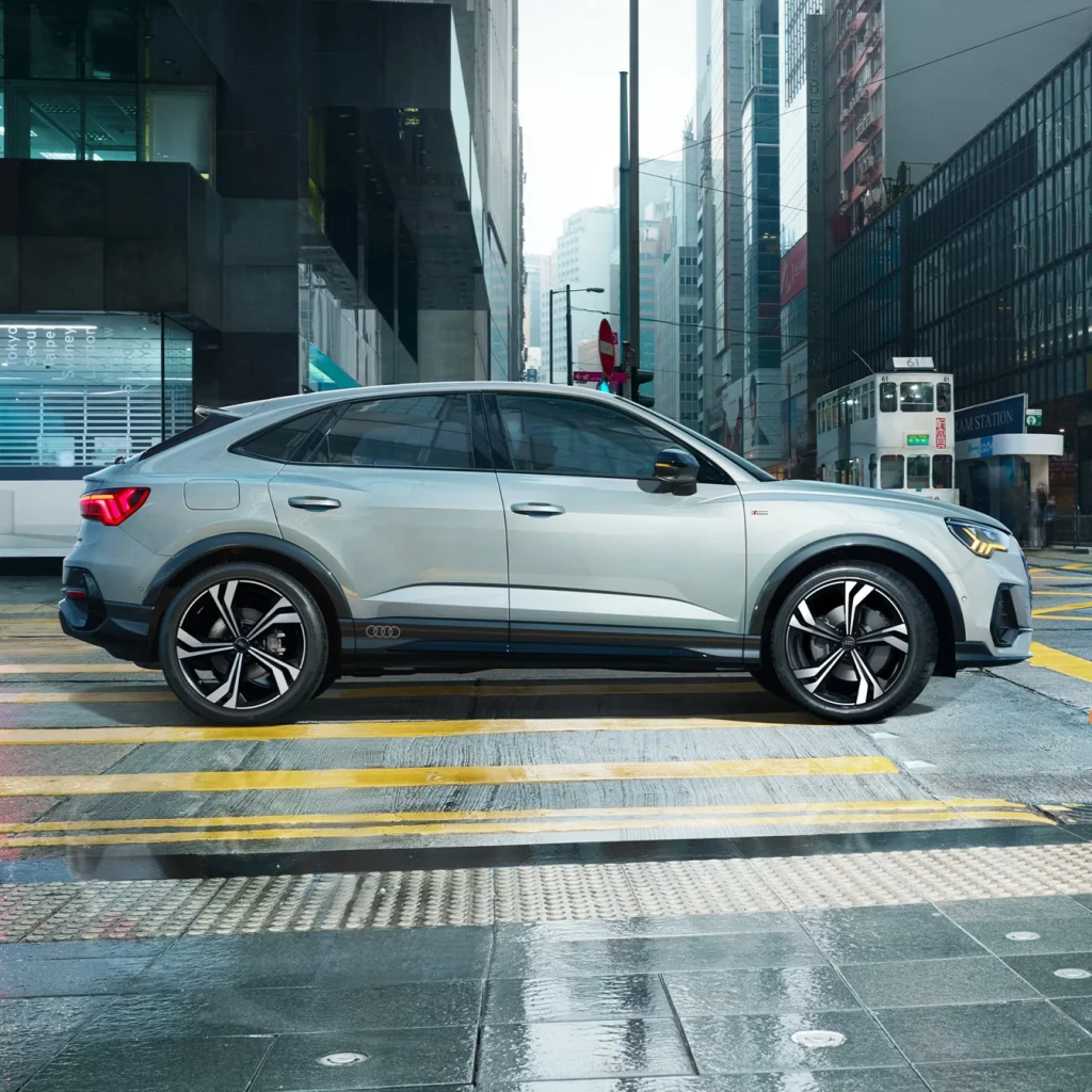 The large Singleframe grille in octagonal design and the side air inlets dominate the front of the Q3 Sportback. From the side, the coupé-like silhouette is unmistakeable. Characteristics of the rear include the flowing, sloping roof line, the low rear window and the sharply contoured rear lights. Customise the exterior to suit your individual taste. If you choose the optional S line, your Audi Q3 Sportback will come with bumpers in contrasting paint finish, alloy wheels in 5-V-spoke S design, illuminated door sill trims with aluminium inlays and S logo at the front and more.