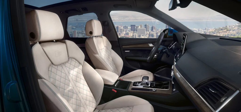 The range of features for the seats extends to a massage function. In the dark, the optional ambient light package plus adds attractive accents – standard in the interior design selection package. Connected to the world – a matter of course in the Audi Q5. With Online Points of Interest, for example, you can display nearby petrol stations or car parks directly in the optional MMI navigation plus with MMI touch. Including opening hours, availability and prices.