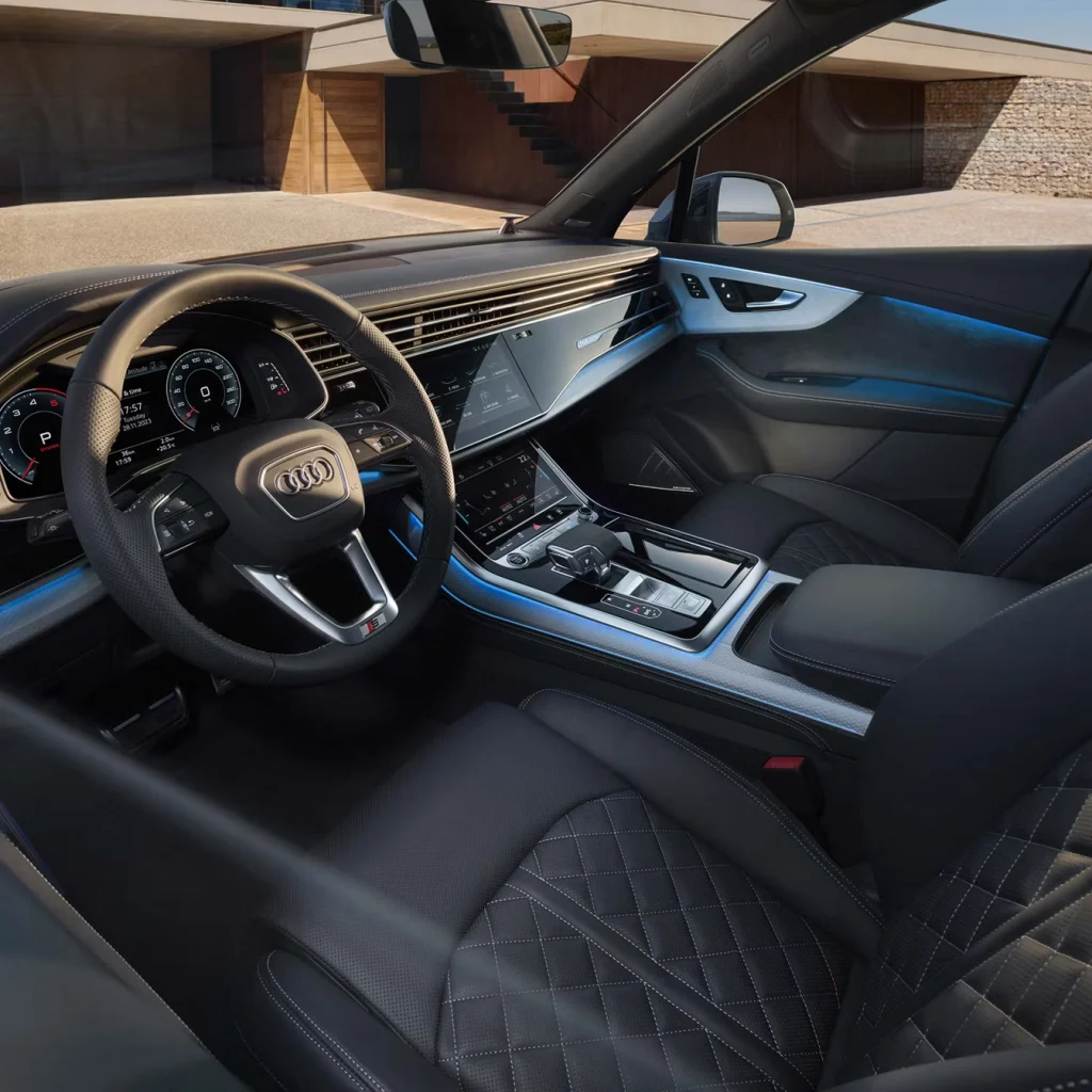 The new Audi Q7 SUV displays its off-road DNA with classic quattro architecture and a powerful shoulder line. The striking Audi Singleframe, Audi rings in flat 2D look and, in particular, the design features of S line all contribute to its sporty appearance.