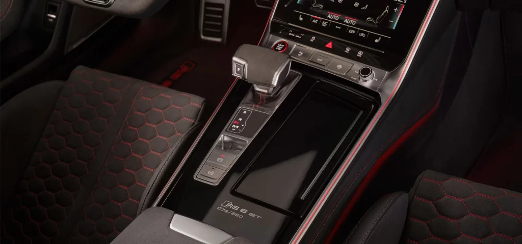 The special features of the RS 6 Avant GT, are continued inside the vehicle: for example, with door rails and dashboard in Dinamica microfibre, black and inlays in Dinamica microfibre, deep black. The striking contrasting stitching in gloss copper and red are equally as exclusive.