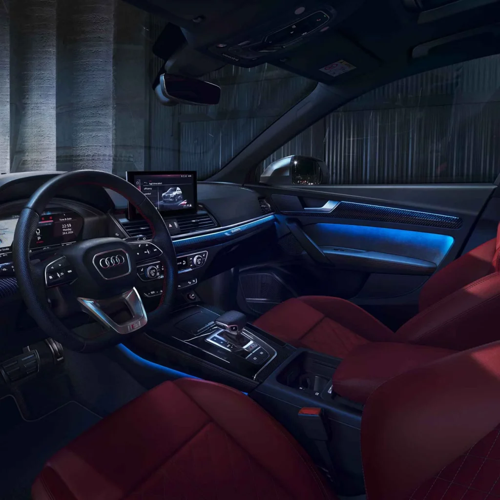 The design of the Audi SQ5 impressively reflects the vehicle’s sporty dynamics and confident performance. The design of the sill trims creates a visual lightness and signals impressive ground clearance. Striking bumpers integrate heavily contoured air inlets with aluminium frames at the front and a diffuser with surrounding chrome trim at the rear. Twin oval tailpipe trims in chrome ensure a sporty finish. The Audi Singleframe in honeycomb look with aluminium inlays in the honeycomb grille lends the front a self-assured character.