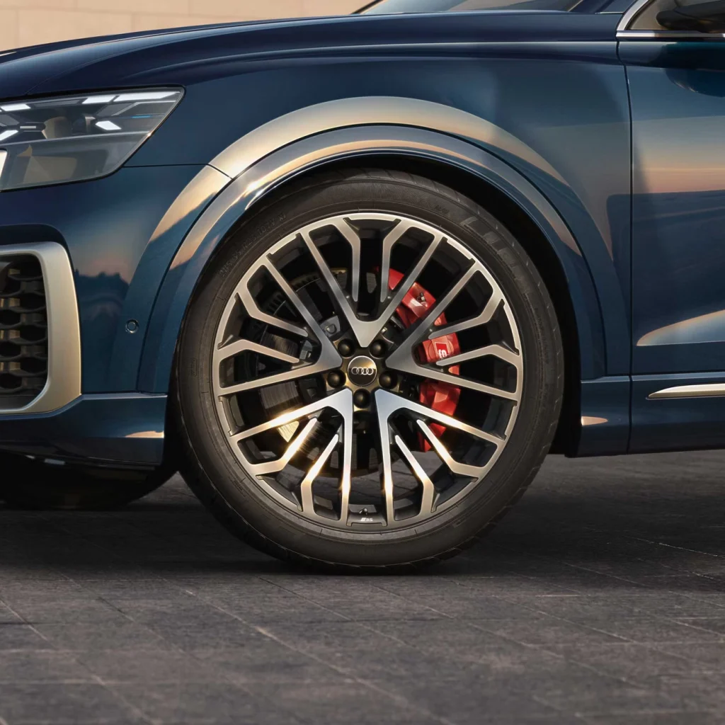 In Waitomo blue, metallic and with panoramic glass sunroof, the Audi SQ8 SUV likes to impress. The exterior mirror housings in aluminium look and the brake callipers in red are eye-catching details that exude exclusivity.